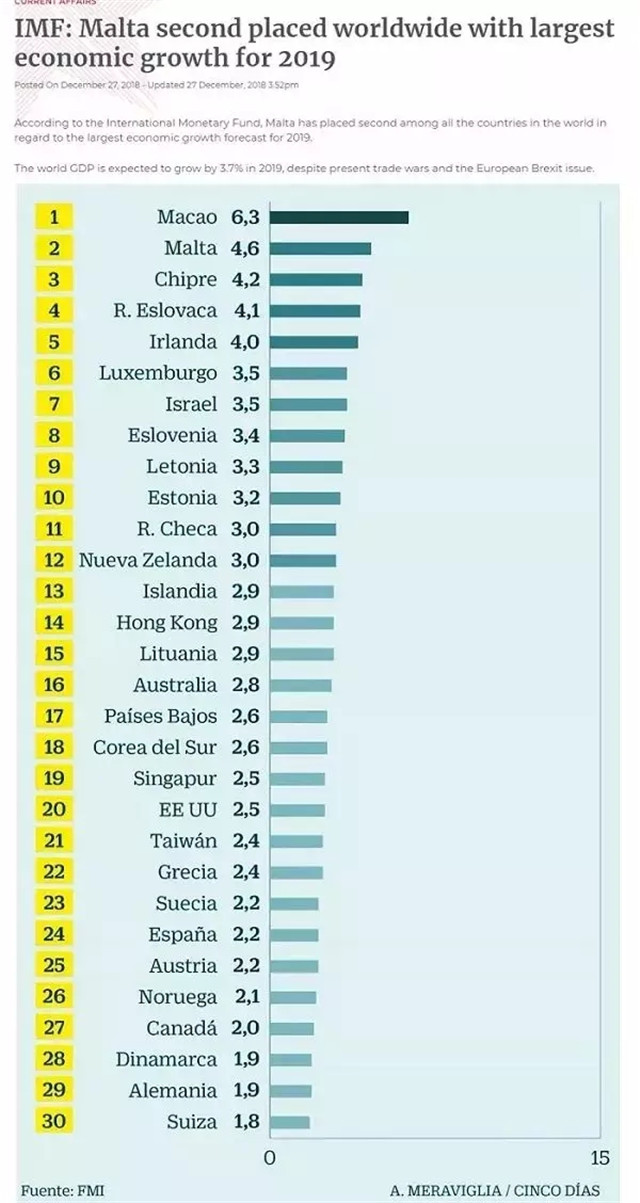 根据国际货币基金组织的数据显示,在经济增长预测方面,预计2019年世界GDP增长幅度将达到3.7%。而马耳他在全世界所有国家中排名第二,2019年增长至少4.6%,继续保持欧洲国家中最高的经济增速。